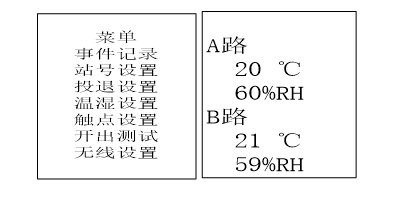 裝置通電開機(jī)后液晶屏顯示如下界面,時(shí)鐘逐秒跳動(dòng)表示裝置正在運(yùn)行。如果顯示的并不是當(dāng)前日期和時(shí)間,請(qǐng)參考下面提及的步驟進(jìn)行設(shè)置。裝置開機(jī)界面顯示2路溫濕度實(shí)時(shí)值和觸點(diǎn)測(cè)溫?cái)?shù)據(jù)如下圖所示: