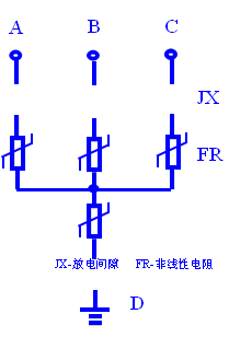三相組合式過電壓保護器(HKCBP)的電氣原理如圖一所示,圖中FR為高能容氧化鋅非線形電阻,JX為放電間隙,由于采用對稱結(jié)構(gòu),其中任意三個可分別接入A、B、C三相,另一個接地線。